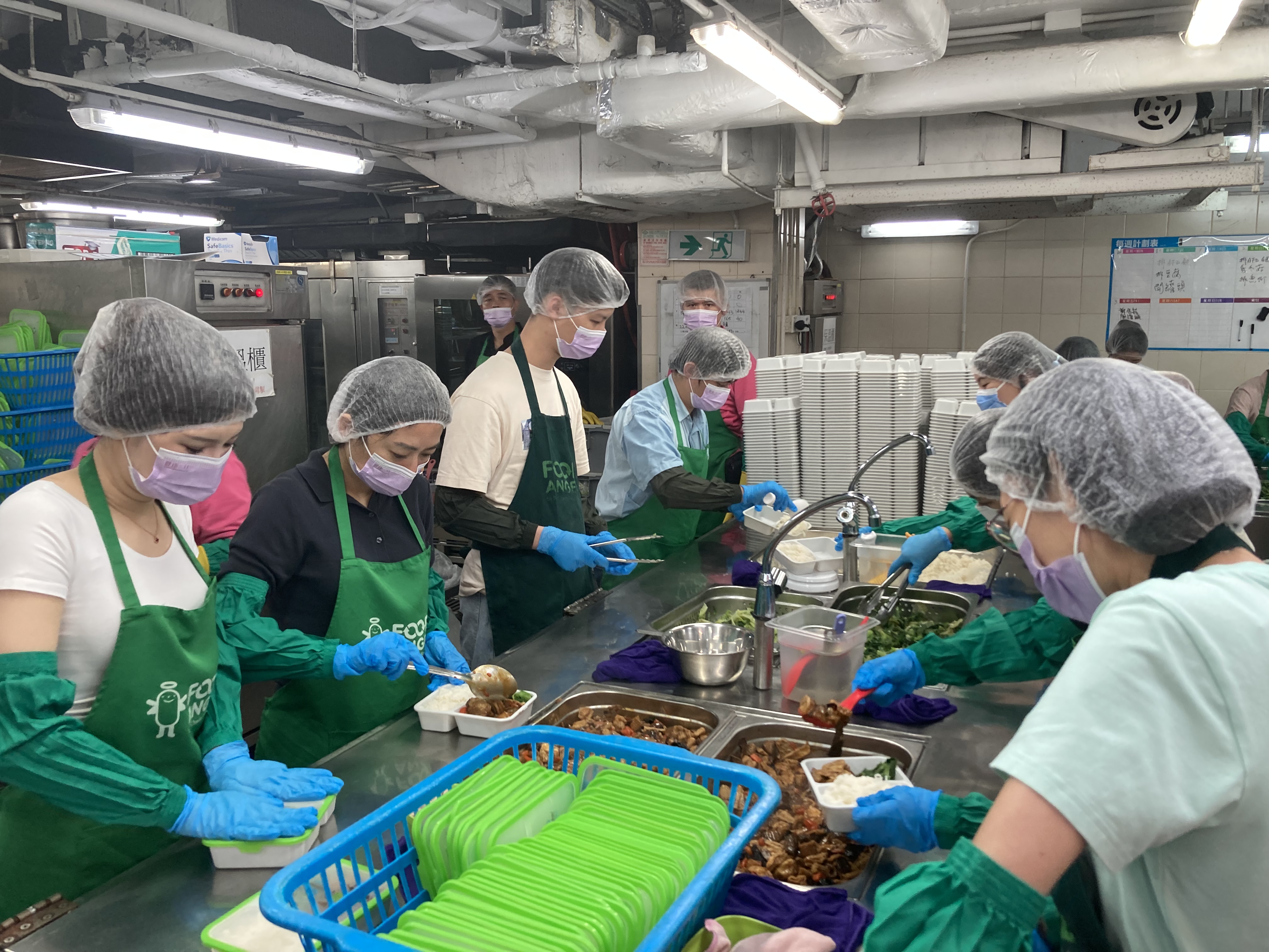 中国人寿(海外)义工队在“惜食堂”位于深水埗的厨房协作处理食材、制作饭餐,共合力制作了1800份饭餐。
