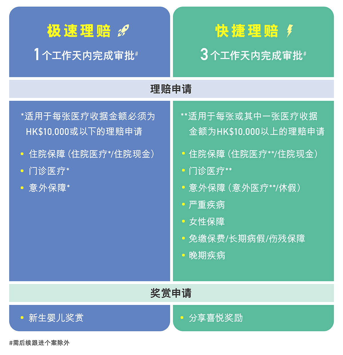 简单几步即可提交理赔申请,并可查阅申请进度、下载电子通知书及於每一节点接收消息通知,让您对进展了如指掌。 HK$10,000或以下的医疗收据更无需寄回正本3 |