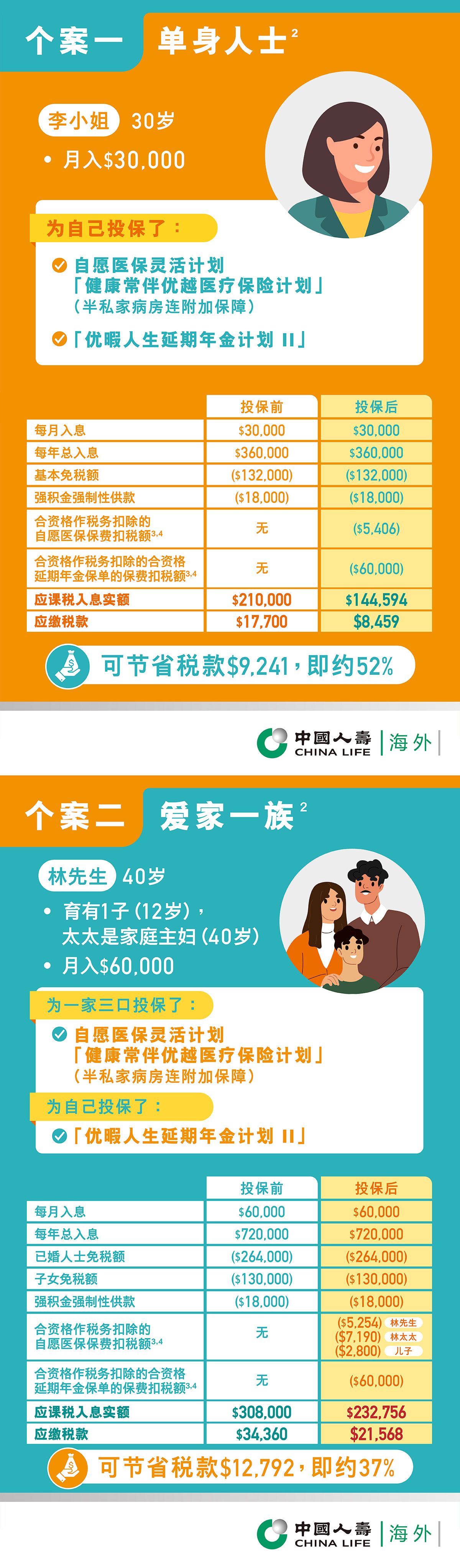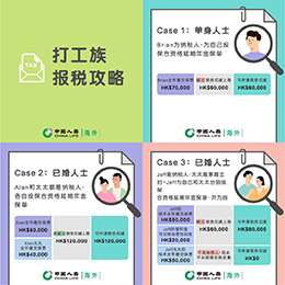 - 以上个案乃根据2024/25课税年度之免税额、扣减项目及税率而计算。个案假设(i) 没有任何强积金可扣税自愿性供款申请及;(ii) 除上述免税额及扣减项目外,纳税人没有其他免税额、扣减项目或税务优惠;及 (iii) 应缴税款是以相关个案之应课税入息实额按累进税率计算。上述例子仅供参考,实际可节省的税款视乎纳税人的应课税入息及适用之税率而有所不同,以上资料并无考虑个别人士的具体情况(包括但不限于个人背景、需要、财务状况等),因此客户不应单凭这些资料作出任何投保决定。就以上资料的内容作出任何决定之前,请向专业人士寻求独立意见。
