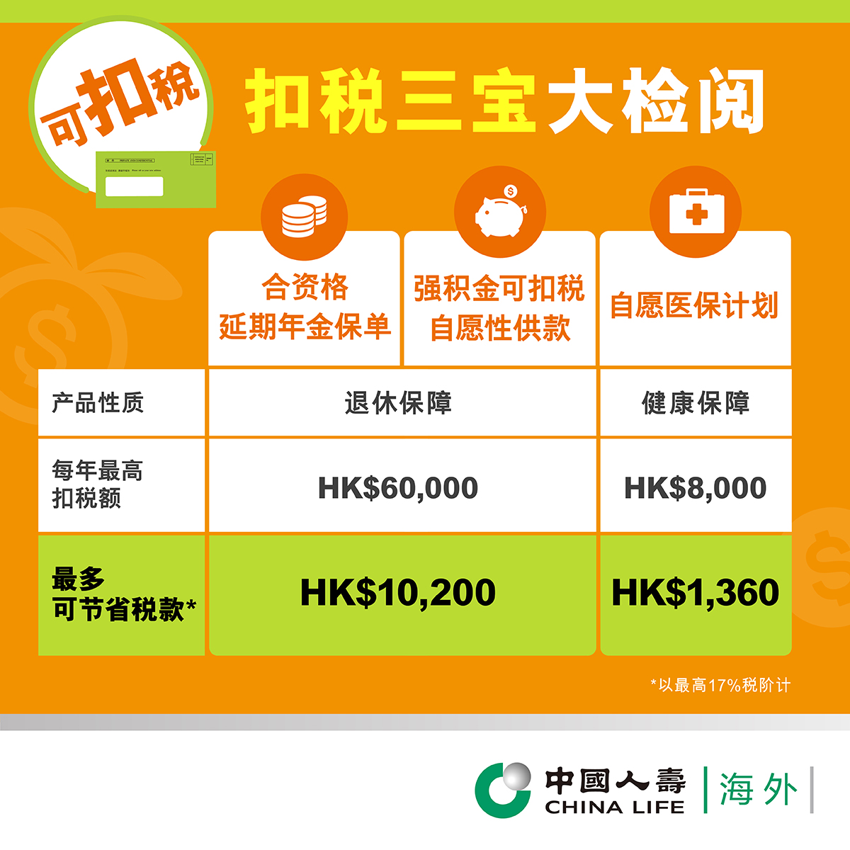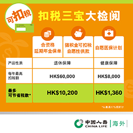 只要您手上有「扣税三宝」,就可以用来扣税。如果还没有,就在3月31日前,即是课税年度完结前购买,到报税时可以申请扣税,每年可享有高达68,000港元扣税额1!