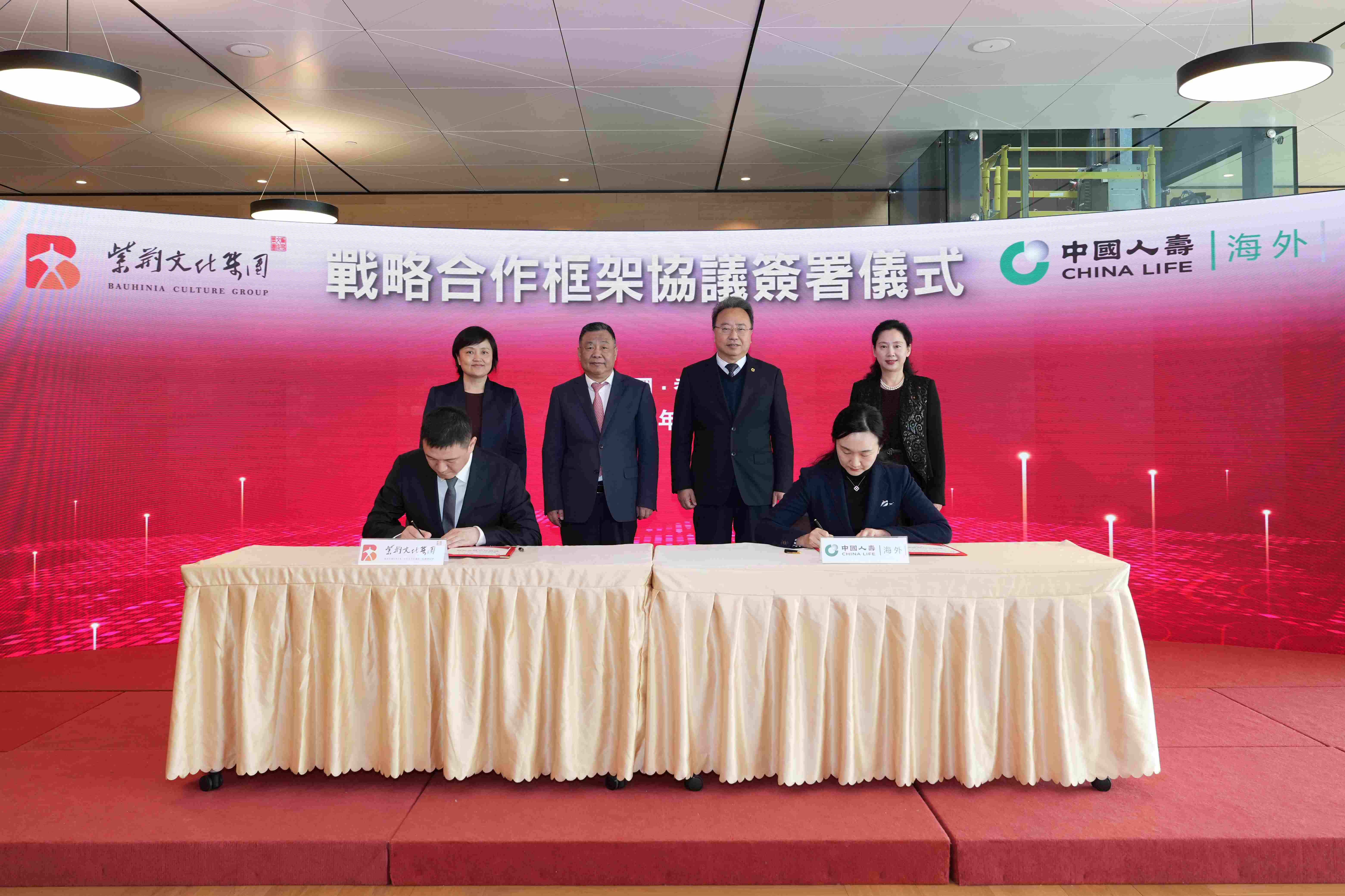 為貫徹落實中國人壽「333戰略」,進一步全面深化改革,2025年2月26日,中國人壽保險(海外)股份有限公司(簡稱「中國人壽(海外)」)與文化央企紫荊文化(香港)集團有限公司(簡稱「紫荊文化集團」)在香港紅磡中國人壽中心簽署戰略合作框架協議。中國人壽(海外)總裁劉月進先生、副總裁康樂女士,紫荊文化集團董事長許正中先生、副總經理薛麗軍女士見證雙方代表簽署協議。