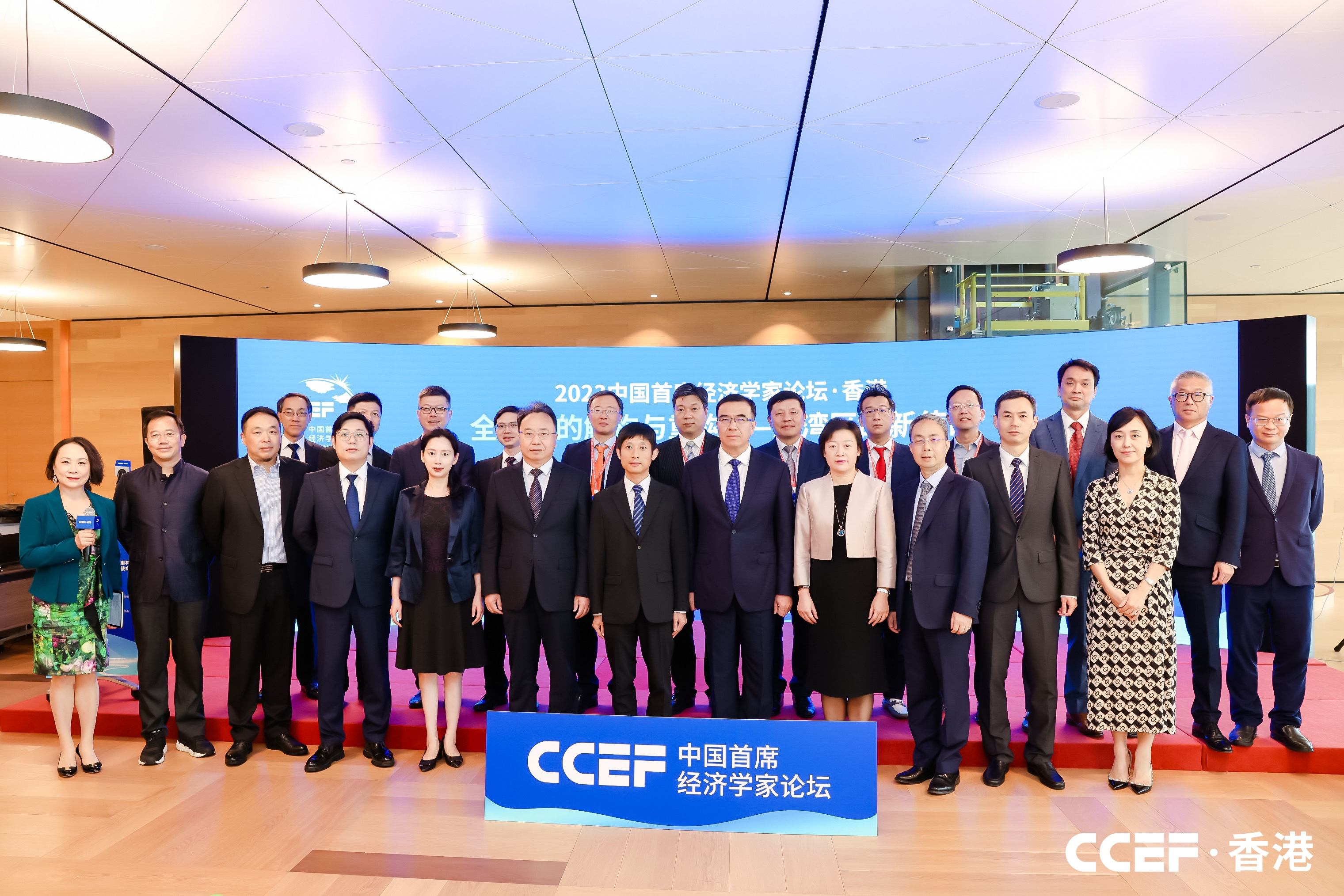 「2023年度中國首席經濟學家香港論壇」在中國人壽中心17樓的中國人壽國際金融研修院舉行。與會嘉賓合影留念。