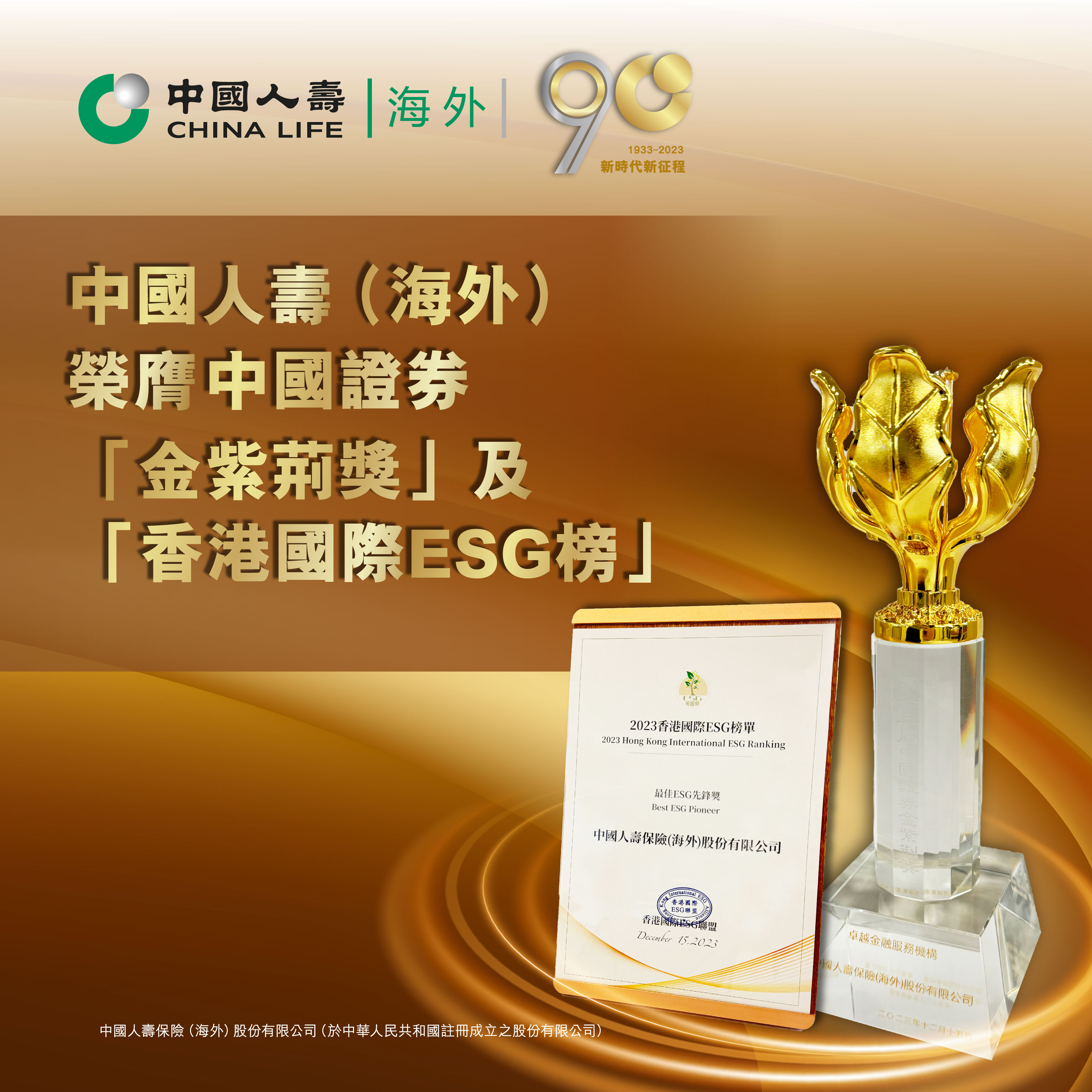 中國人壽(海外)榮膺中國證券金紫荊獎「卓越金融服務機構」及香港國際ESG榜單「最佳ESG先鋒」獎兩項殊榮。
