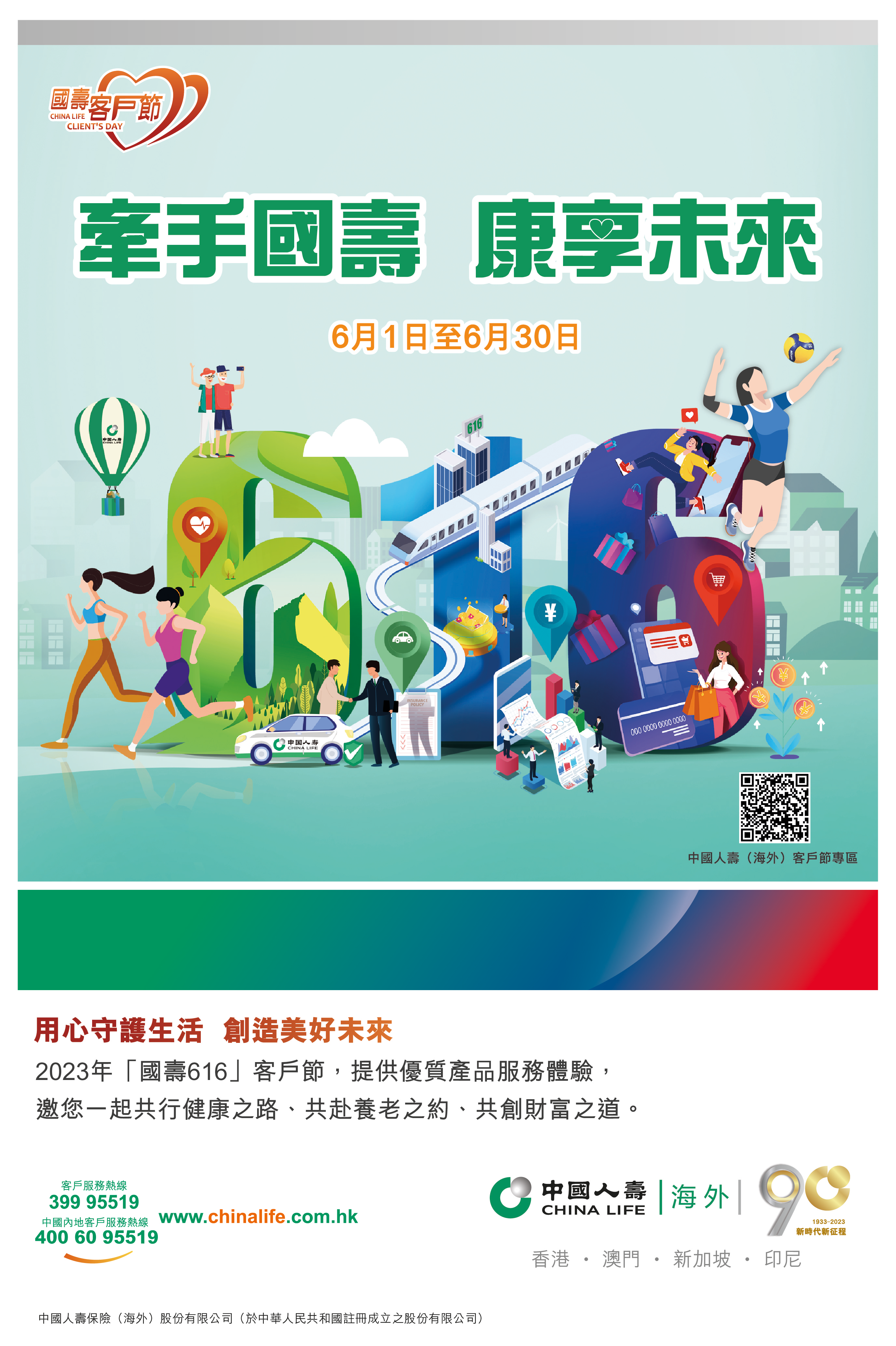 2023年「國壽616」客戶節於6月1日隆重揭幕,作為中國人壽集團的年度盛事,中國人壽保險(海外)股份有限公司(「中國人壽(海外)」)誠意呈獻一系列精彩的線上線下活動,以產品優惠、豐富多彩的活動答謝廣大客戶一直以來的支持。