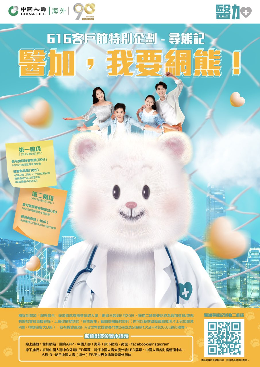 由即日起至2023年6月30日,登記成為醫加會員或現有會員直接登錄,再上傳捕捉到的「網熊醫生」截圖或照片到「醫加,我要網熊」活動頁面(https://bit.ly/41hKra4),就有機會贏取「中國人壽(海外)FIVB 世界女排聯賽香港 2023 門票2張」或「洗牙服務 1 次連港幣200元超市禮券」6。
