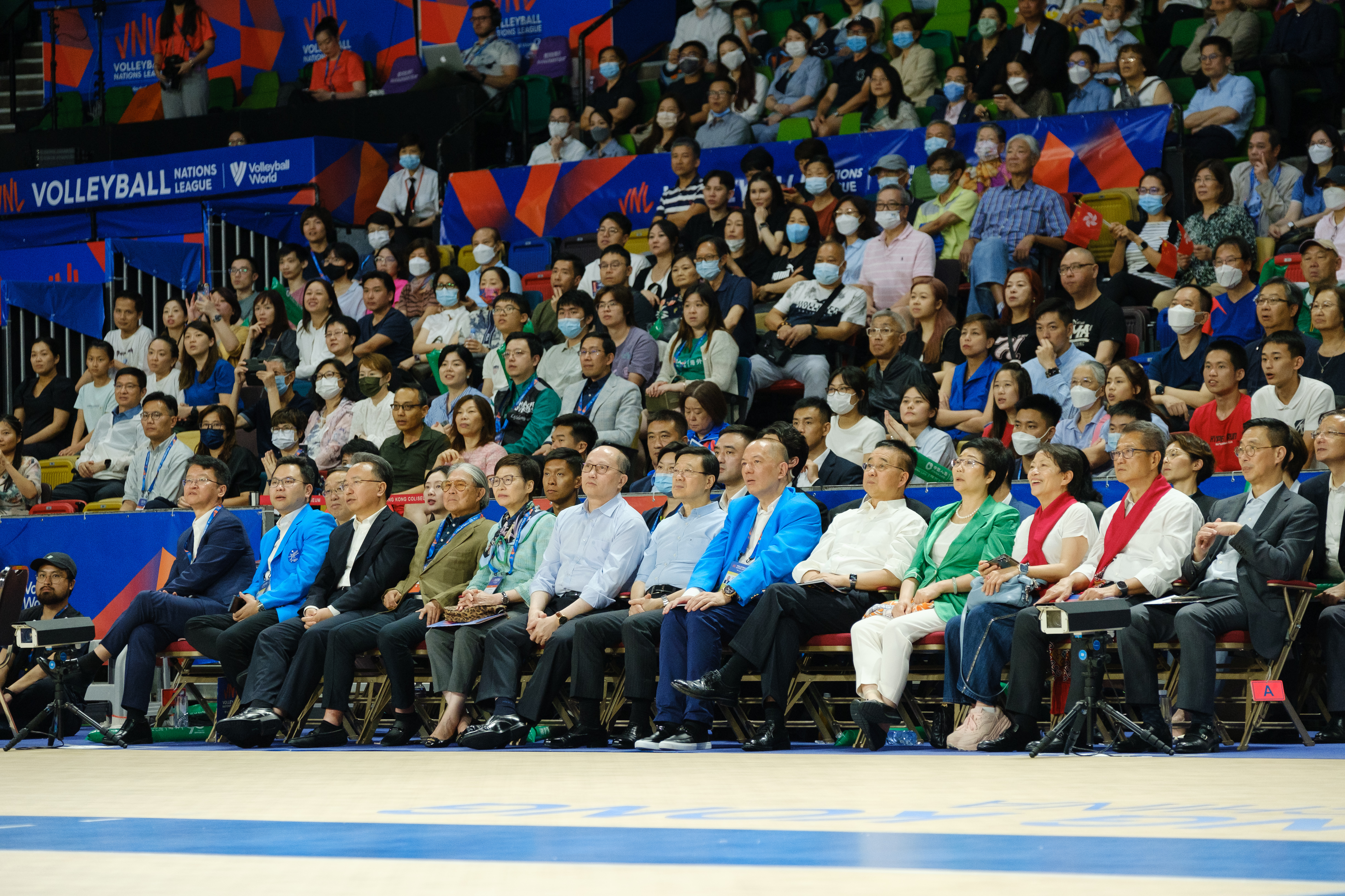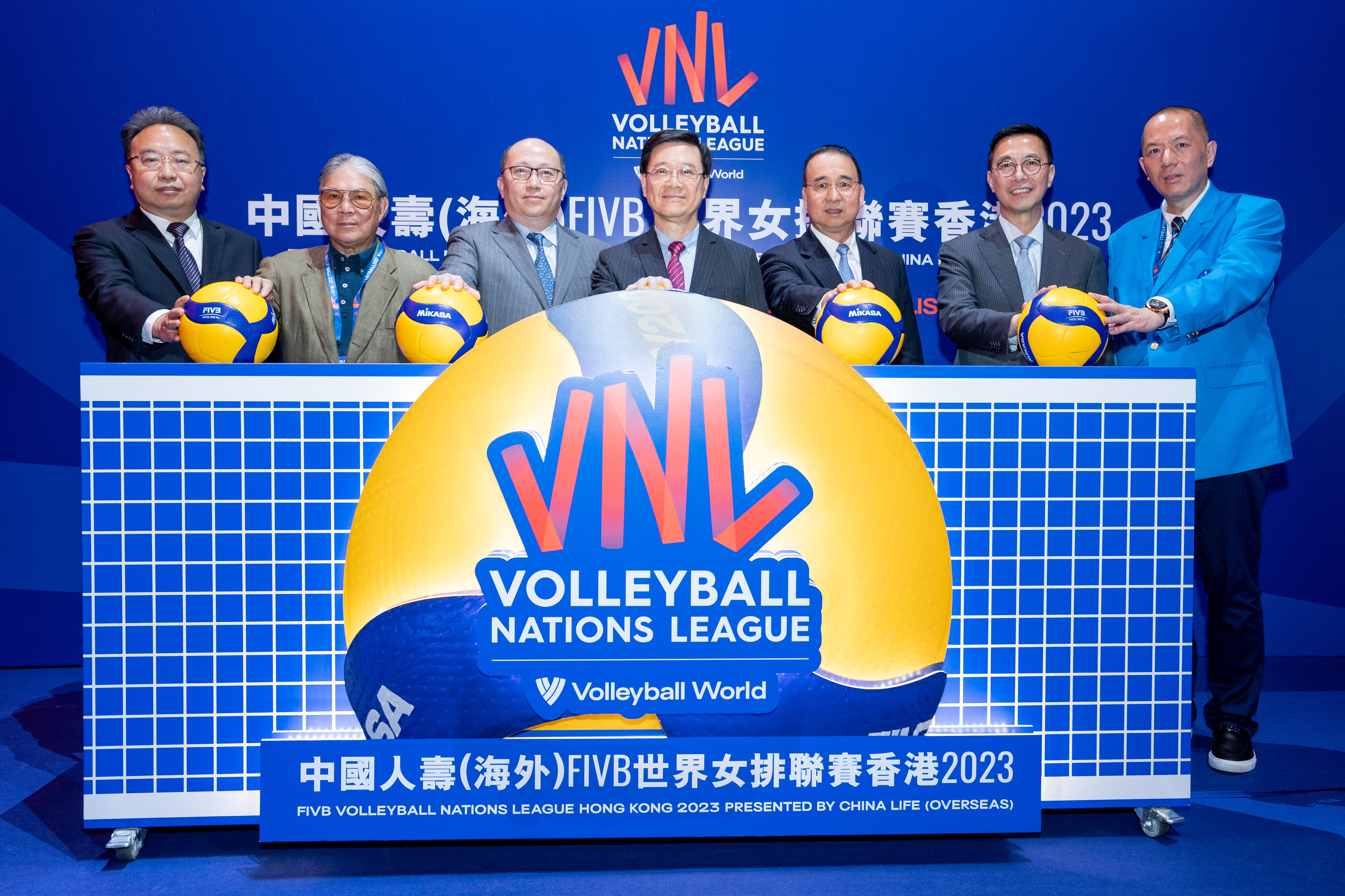 香港特別行政區行政長官李家超(中)、中央人民政府駐香港特別行政區聯絡辦公室主任鄭雁雄先生(左三)、中華人民共和國外交部駐香港特別行政區特派員公署特派員劉光源先生(右三)、中國香港體育協會暨奧林匹克委員會會長霍震霆先生(左二)、文化體育及旅遊局局長楊潤雄先生(右二)、中國人壽(海外)主要負責人劉月進先生(左一)、以及香港排球總會會長吳守基先生(右一),為「中國人壽(海外)FIVB世界女排聯賽香港2023」開幕典禮擔任嘉賓並主持揭幕儀式。