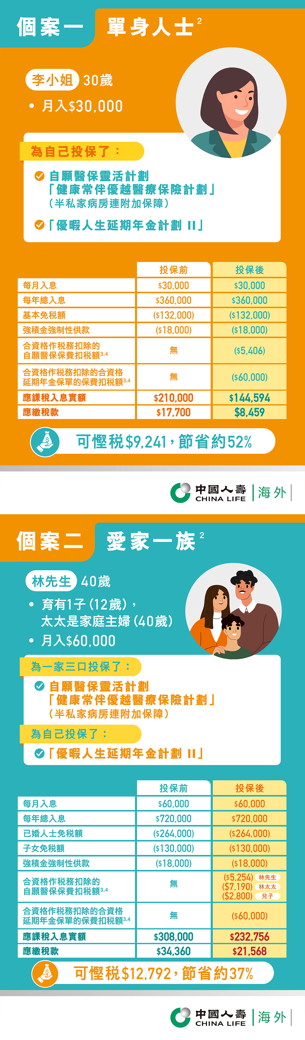 - 以上個案乃根據2024/25課稅年度之免稅額、扣減項目及稅率而計算。個案假設(i) 沒有任何強積金可扣稅自願性供款申請及;(ii) 除上述免稅額及扣減項目外,納稅人沒有其他免稅額、扣減項目或稅務優惠;及 (iii) 應繳稅款是以相關個案之應課稅入息實額按累進稅率計算。上述例子僅供參考,實際可節省的稅款視乎納稅人的應課稅入息及適用之稅率而有所不同,以上資料並無考慮個別人士的具體情況(包括但不限於個人背景、需要、財務狀況等),因此客戶不應單憑這些資料作出任何投保決定。就以上資料的內容作出任何決定之前,請向專業人士尋求獨立意見。