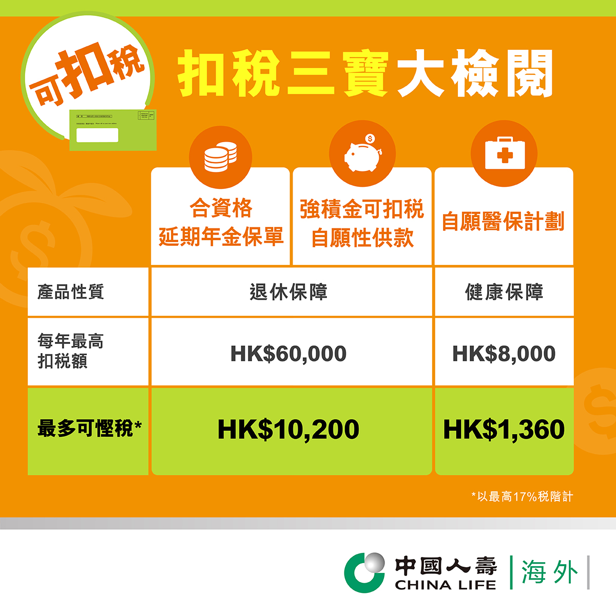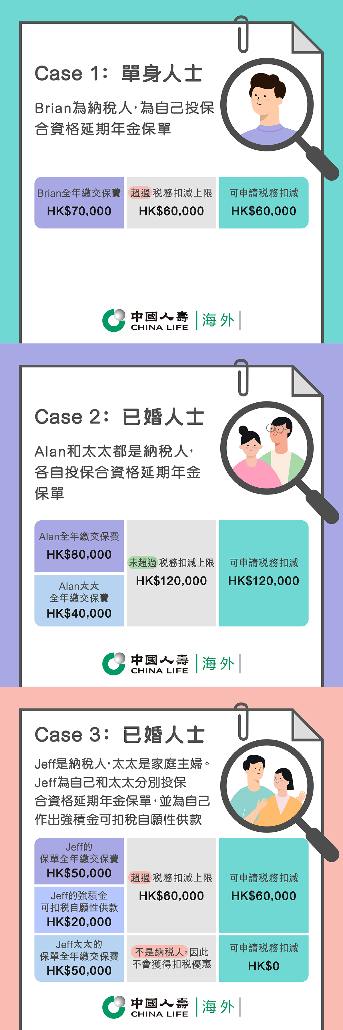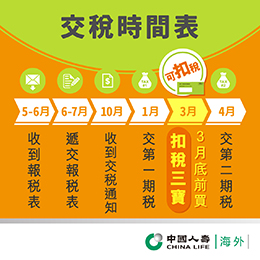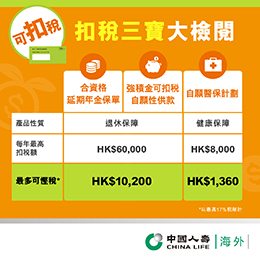 在此提及的任何一般稅務資料僅作參考用途,並不構成任何稅務或財務的建議。您不應單憑這些資料作出任何稅務相關決定。中國人壽(海外)不能提供任何稅務、法律或會計建議或諮詢。如有任何疑問,請諮詢稅務局(網頁www.ird.gov.hk)或尋求您的獨立稅務、法律和會計顧問。